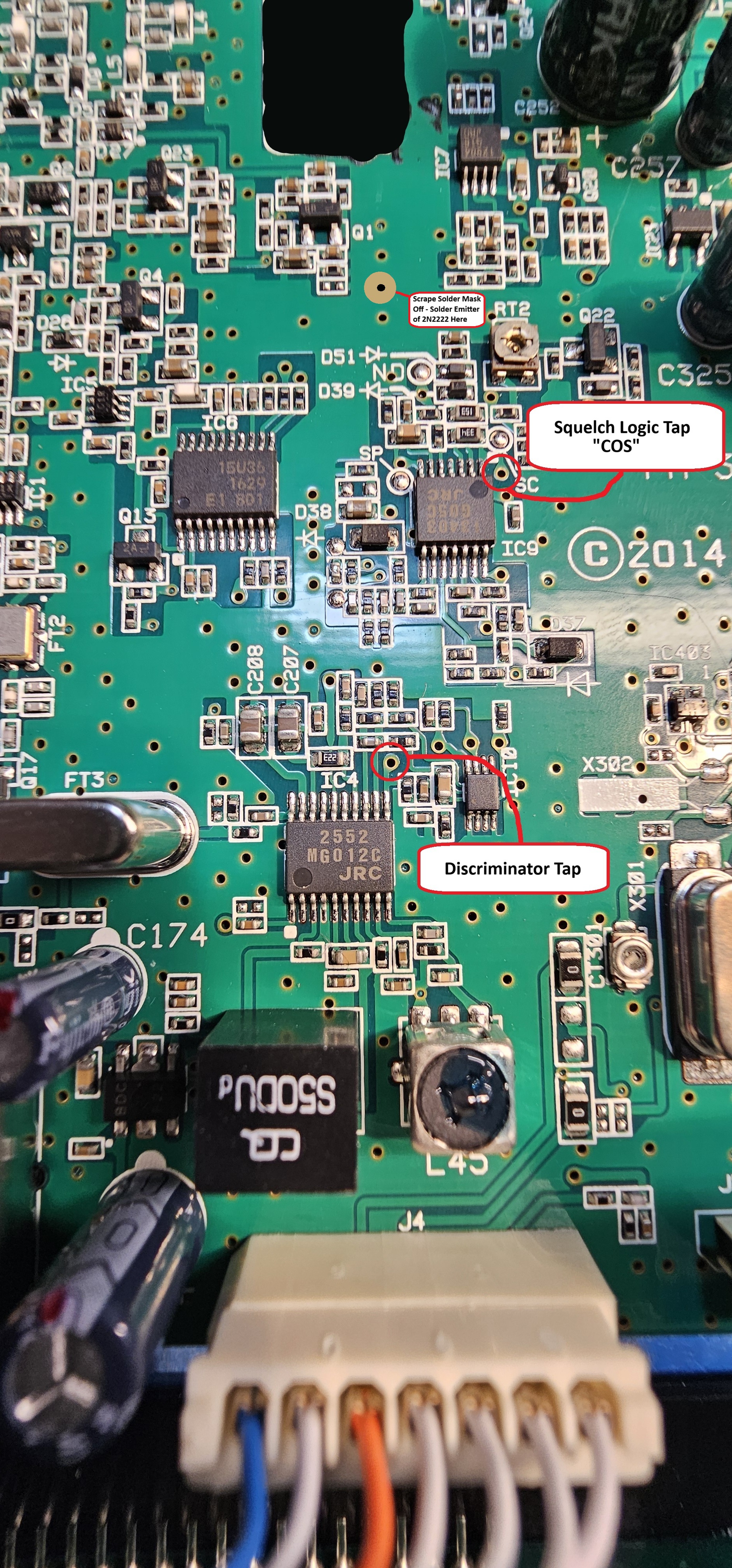 A 2N2222 transistor is installed by connecting its emitter to the ground plane of the circuit board at a convenient location. Connect a (red) wire of sufficient length from the ring lug of the jack to the collector lead of the 2N2222 transistor. The ring lug is the short gold connection on the jack. The squelch logic (COS) tap is connected to the base of the transistor through a 4.7k resistor. The squelch logic (COS) tap is a trace / hole beside a 330k (334) surface mouunt resistor close to pin 1 of the JRC13403 IC. This connection transitions from (approximately) 0V to 3.3V between squelched and unsquelched. Use a volt meter (DMM) and the photos above to positively identify the location.