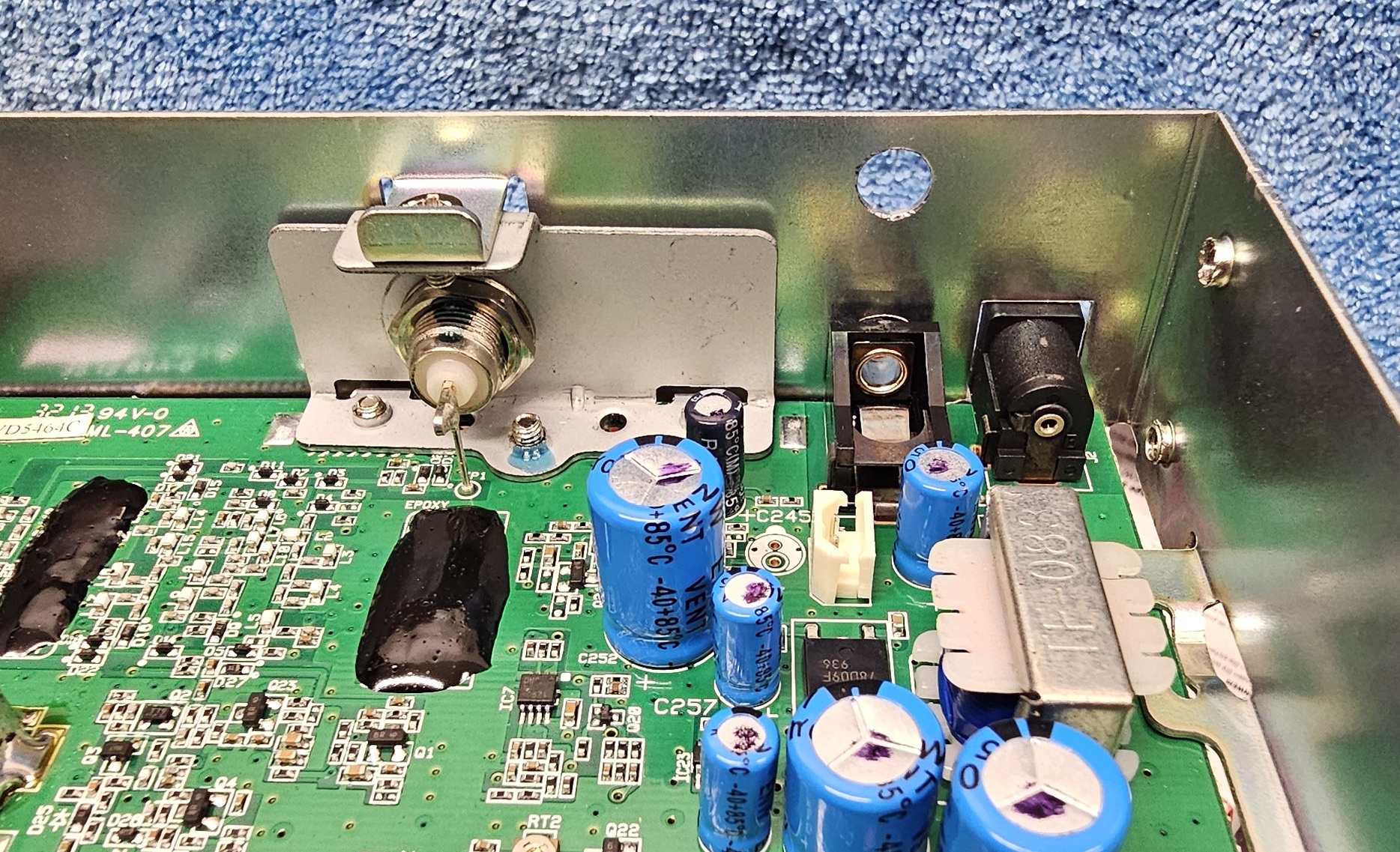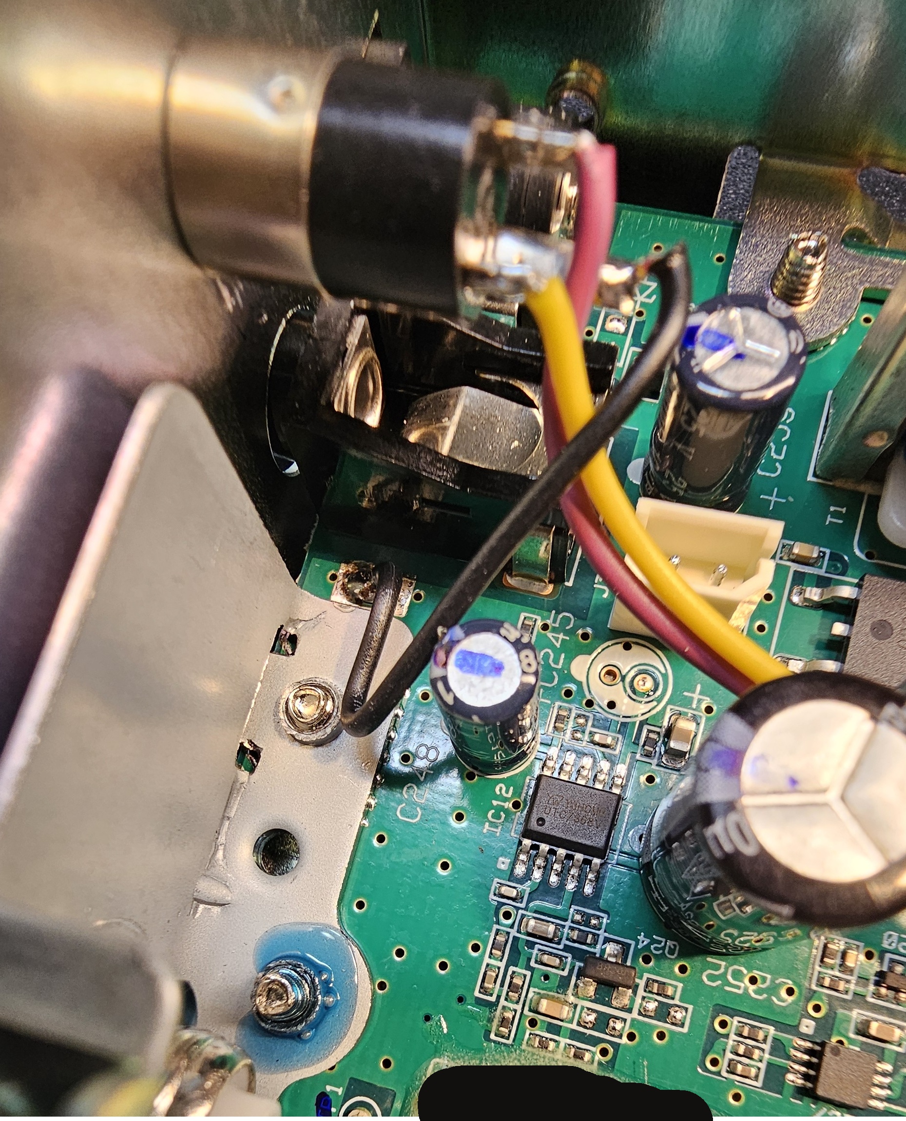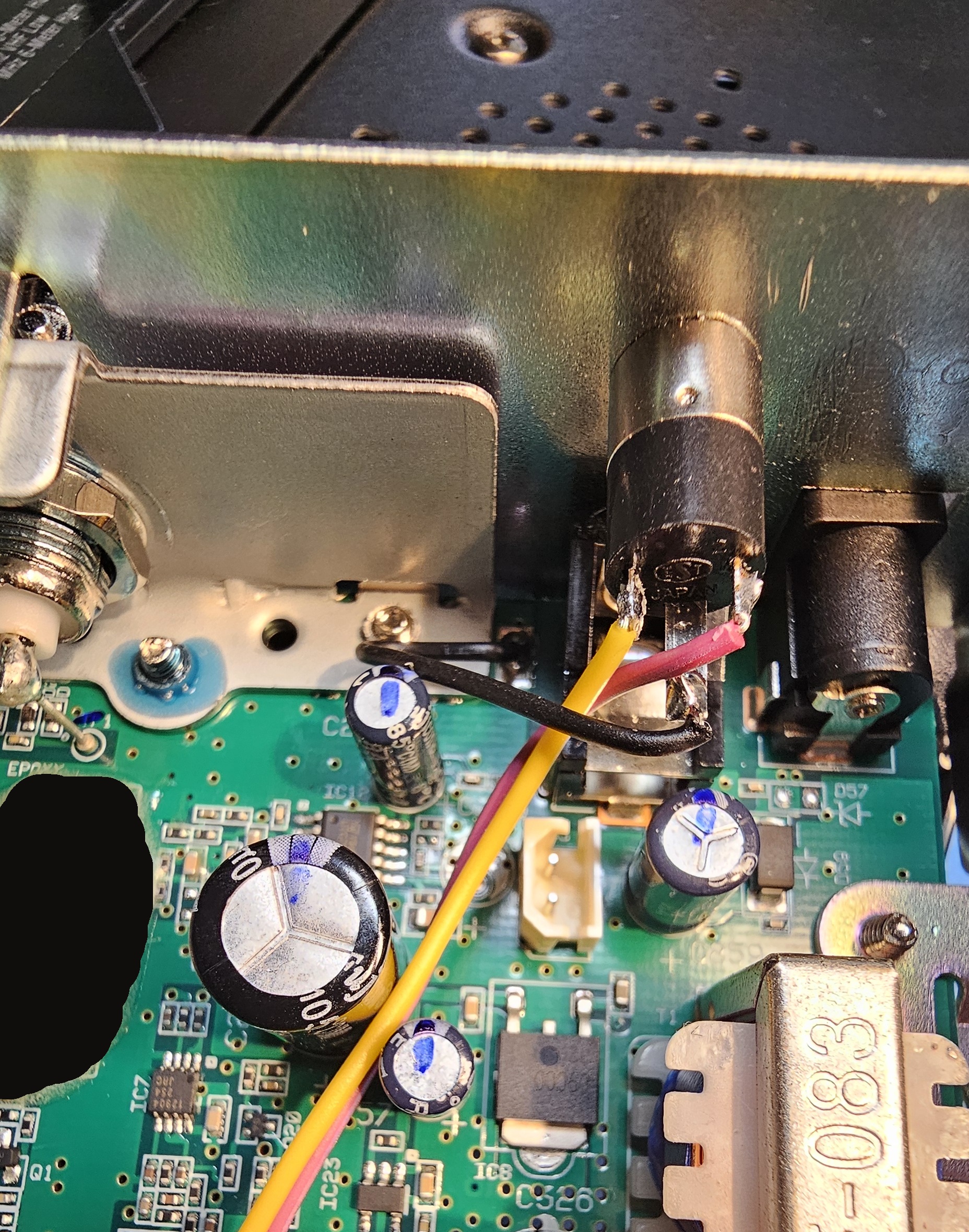 Connect a wire from ground of the circuit board to the ground lug of the jack. The ground lug is the longer silver connection of the three. There is a convenient spot on the top of the circuit board between the speaker jack and some tinwork of the rear panel. See photos.